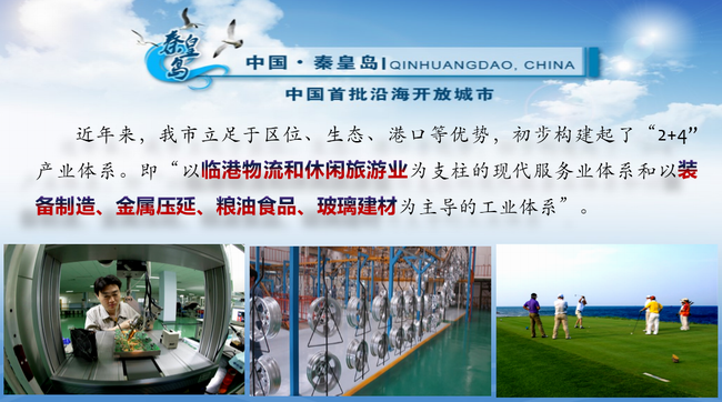 秦皇岛是一座新兴工业城市。机械制造、金属压延、粮油食品、玻璃建材四大临港产业初具规模,以装备制造业为主导的先进制造业,以电子信息、光机电一体化、生物医药、新材料及新能源与环保为重点的高新技术产业,以港口物流、休闲及商务旅游为主体的现代服务业,正在迅速兴起。秦皇岛正在成为中国北方最大的粮油加工基地、重型装备出海口基地、百万吨船舶生产制造基地、全国优质干红葡萄酒生产基地、玻璃生产及深加工基地、世界级轮毂制造基地、国内最大的铝制品生产加工基地、亚洲最大的复合肥生产基地、中国消防电子产品生产研发基地等。